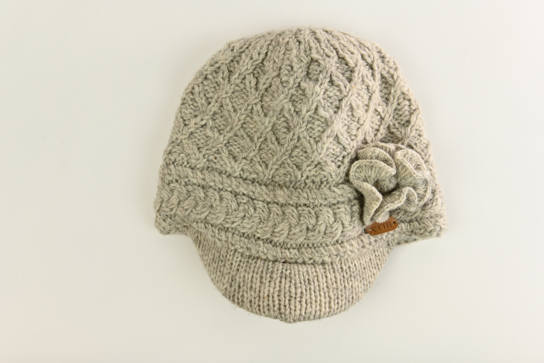 Pk1640 Aran Trellis Peak Hat with Flower Oatmeal